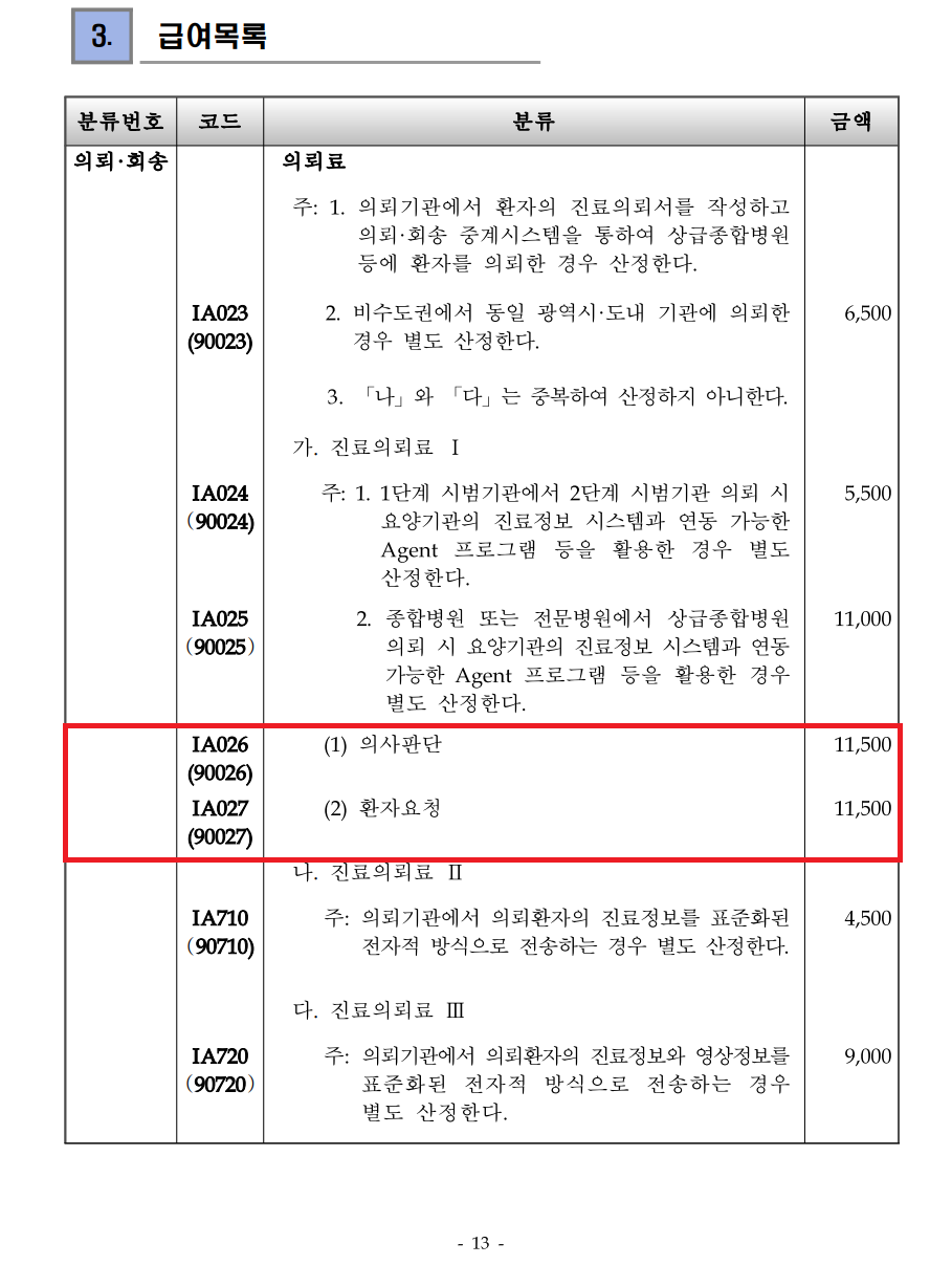 의뢰료의 기본 수가는 IA026 또는 IA027 이며 나머지 의뢰료 수가 코드는 해당되는 경우에 “추가”로 산정하는 코드입니다.
