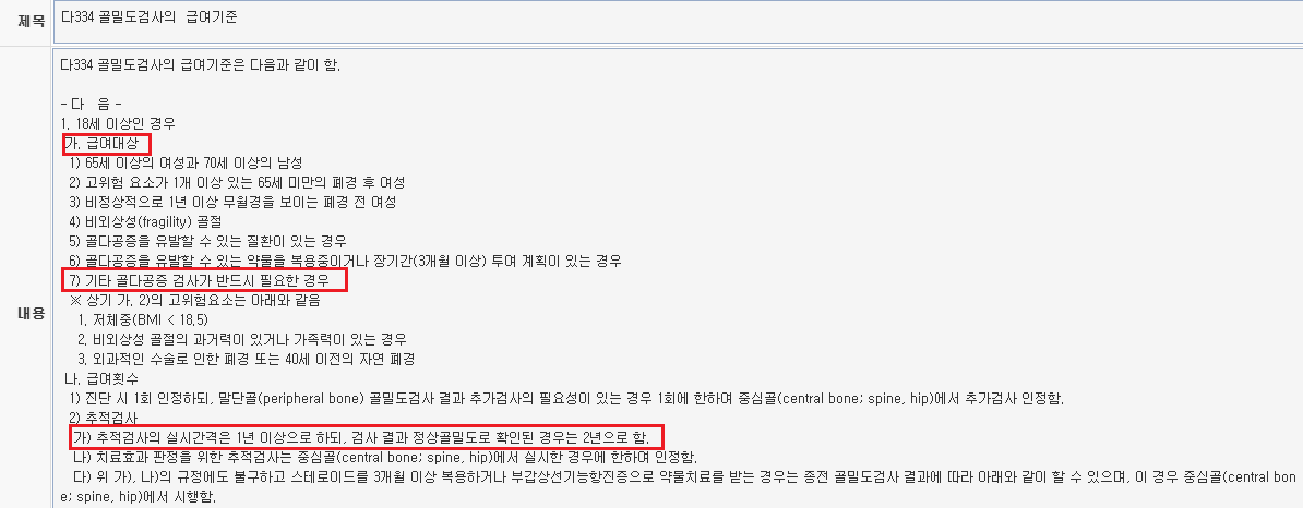 안녕하십니까 보험이사 최대한입니다. 현재 골밀도검사의 급여기준에서 추적검사의 부분을 잘 활용하시면 진료에 유용하겠습니다. 1. 골밀도검사의 급여대상에 해당되어 골밀도 검사를 보험급여로 시행했을 때 T score 가 정상인 경우에는 (T score-1 이상) 추적검사가 2년에 1회만 보험급여 적용이 되지만, 비정상으로 확인된다면 (T score -1미만) 1년 후 추적검사가 보험적용이 되겠습니다. 2. 또한 “본인 희망으로 진행한 건강검진 비급여 골밀도 검사”의 결과에서 비정상으로 확인된 경우라고 할지라도, 이 결과는 골밀도검사 급여대상 조건 중 “기타 골다공증 검사가 반드시 필요한 경우”로 판단 될 수 있음으로 1년 후 추적검사에서는 급여적용이 가능하겠습니다. 다만 상기 2. 의 경우는 심평원의 관련 부서에서( 본원 심사기준실, 서울지원 심사1부, 사후관리 심사 부서) 유선상으로 답변을 한 경우이며, 추적검사 급여적용 시 진료차트와 Jx999 에 상세하게 관련 내용을 작성하시길 바랍니다. 진료에 참고하시길 바랍니다 감사합니다.